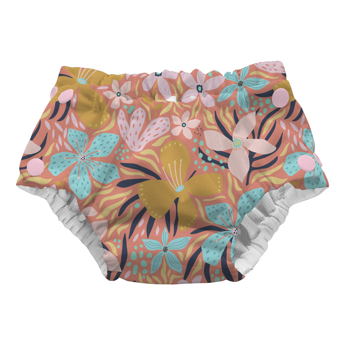 New Thirsties reusable swim diapers are here! Snug-fitting, comfortable and designed to keep messes contained during pool, beach and water fun. Reusable swim diapers combine comfort, style and practicality to keep baby happy in and out of the water. The fit of a swim diaper is intentionally different than a regular diaper cover for the best containment possible and to allow for unrestricted movement in the water without extra bulk. Washable swim diapers are an economical and eco-friendly alternative to disposable single-use swim diapers and convenient side snaps make clean-ups quick and easy too.