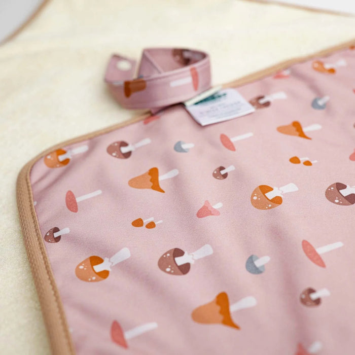 A snap closure strap keeps the change mat nice and tidy in the diaper bag between uses.