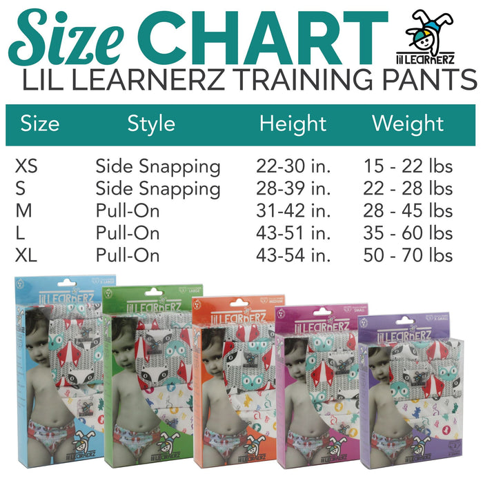 Designed for easy ups and downs, Lil Learnerz 2.0 look and feel just like real underwear with more generous sizing and side-snapping release panels in ALL SIZES - for quick changes if needed. Perfect for early learners who still need a little extra help perfecting those potty trips.